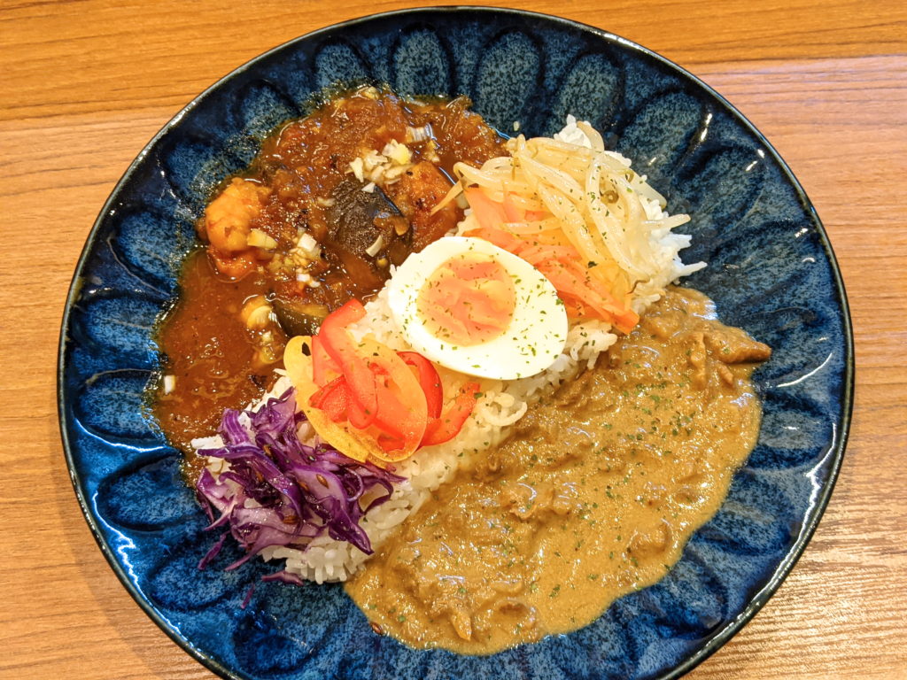 月替わりであいがけカレーを提供しています。訪問した2021年7月は、ポークのチャイカレーとエビチリ風カレーでした。