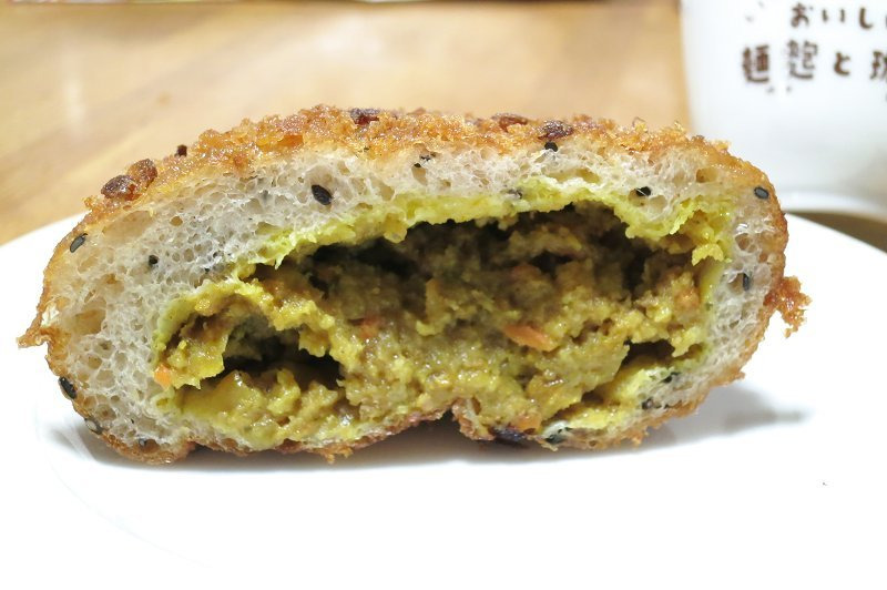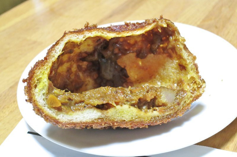 カリカリで生地は薄め。ニンジンやタマネギの入った昔ながらのカレーパンという感じでした。