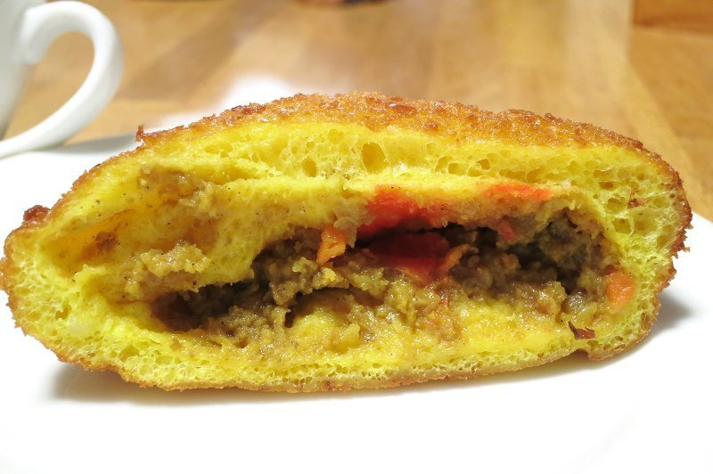 最後にシャンパン☆ベーカリー。生地にターメリックが練り込んであって、しっとりでもサクサクに仕上がっています。こちらもキーマカレーになっていて、ピリ辛でした。赤い部分は福神漬けが入っていて、カレーライスを食べているみたいでした。