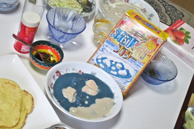 「流氷カレー」はなんとも言えない真っ青なカレーでした。カレー自体はおいしかったのですが、流氷に見立ててるのはわかるんだけど、やっぱり真っ青は食欲のわかない色かな。